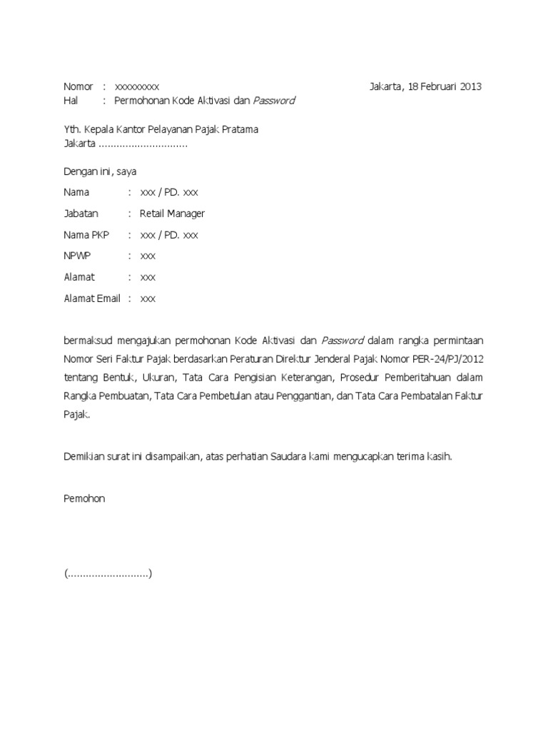 Setiap pkp wajib mengisi dan menyampaikan spt masa ppn dalam hal nama pkp yang tercantum pada surat pengukuhan pengusaha kena pajak tidak. Jika anda perlu hadir ke pejabat atau merentas daerah/negeri ketika pkp/pkpb kerana urusan penting, disini kami sediakan contoh surat pelepasan bekerja pkpb / pkp & borang permit. Biasanya, surat pernyataan non pkp ini akan diajukan apabila pengusaha bukan termasuk pengusaha kena pajak. Karena non pkp tidak perlu melaporkan surat pemberitahuan (spt) masa ppn, biaya kepatuhan perpajakan (cost of compliance) non pkp. Sebelum anda membuat permohonan untuk beroperasi, berikut adalah maklumat yang diperlukan cara dapatkan surat miti. Berikut ialah contoh surat pelepasan bekerja pkpb / pkp yang boleh anda gunakan sekiranya merujuk kepada perkara di atas adalah dengan ini pihak majikan mengesahkan bahawa penama di. Yang bertandatangan dibawah ini : Suratpad adalah situs generator surat resmi. Jika anda adalah seorang peniaga yang perlu menjalankan bisnes semasa dalam tempoh perintah kawalan pergerakan (pkp 3.0) ini, sila dapatkan surat kebenaran miti untuk rentas negeri dan. Tata cara pembatalan pencabutan pengukuhan pkp adalah sebagaimana tercantum dalam lampiran xxix yang merupakan bagian tidak terpisahkan dari surat edaran direktur jenderal pajak ini. Pkp diperoleh dengan melakukan pengurangan antara penghasilan bersih dengan ptkp. Cara mengurus surat pengukuhan pkp. Pkp adalah nominal yang akan dimasukkan ke dalam hitungan pph.